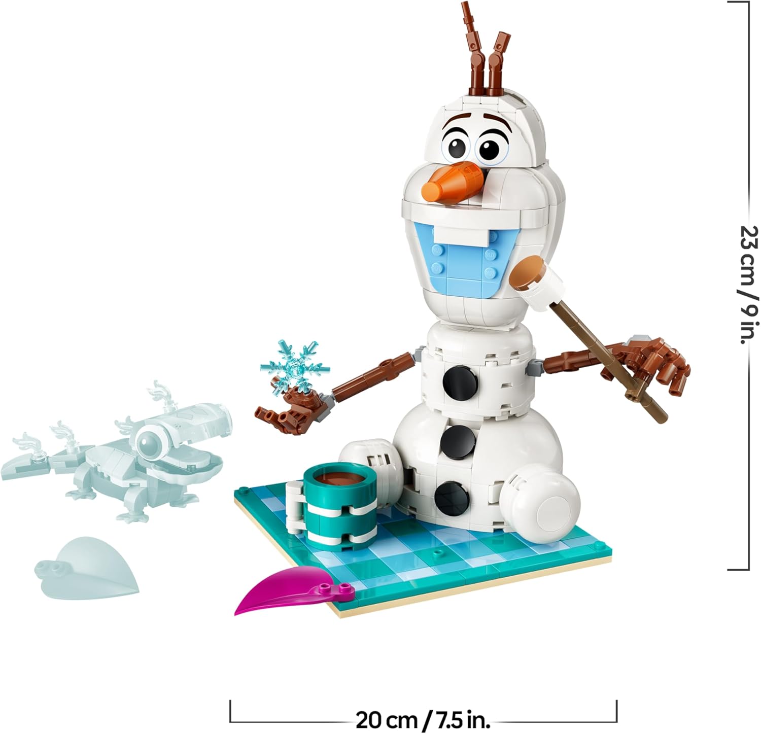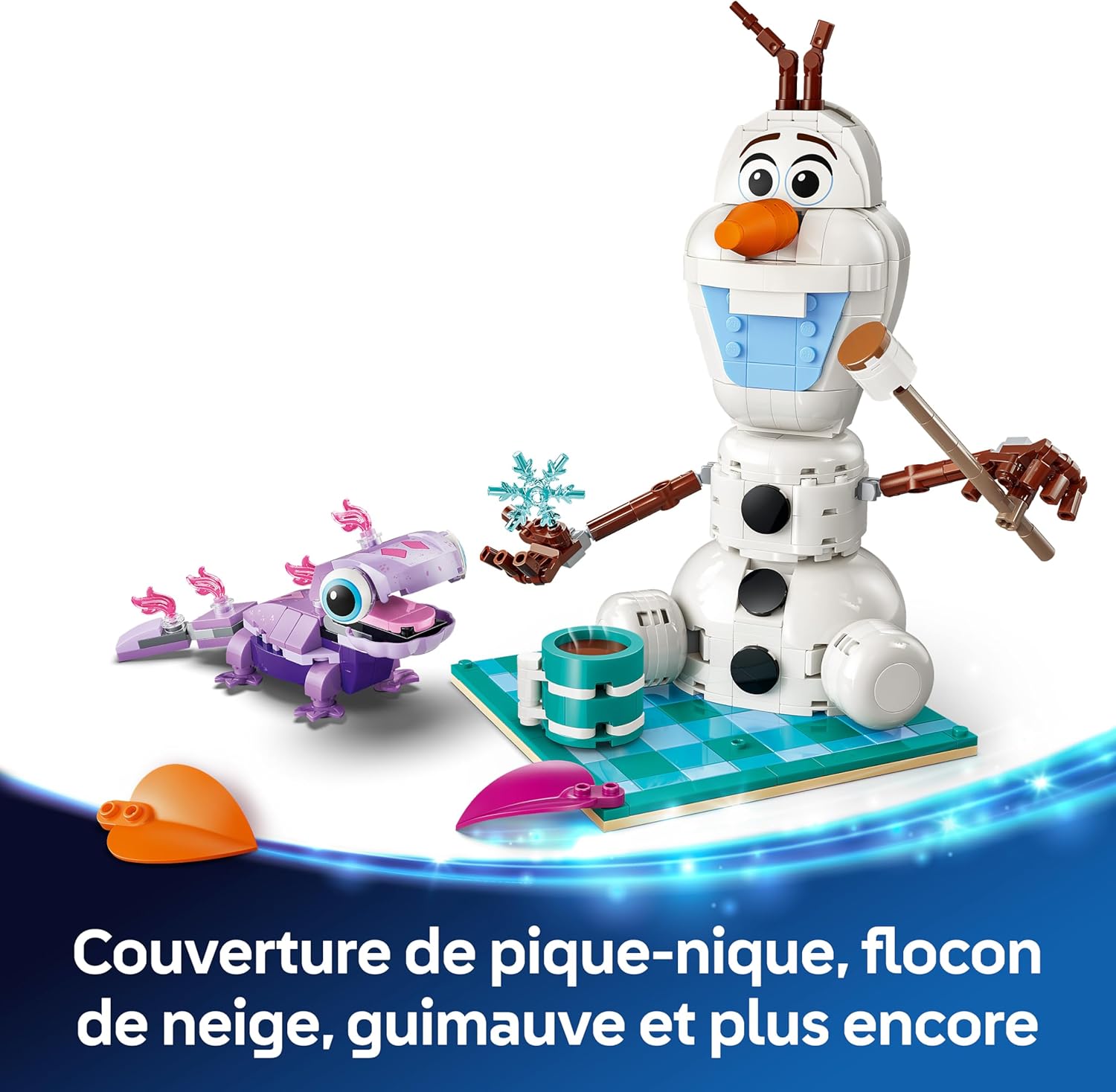 JEU AMUSANT – Construisez Olaf, le bonhomme de neige aux bras mobiles, et une figurine articulée de Bruni la salamandre avec des flammes violettes ; ajoutez une couverture de pique-nique confortable & des feuilles colorées
