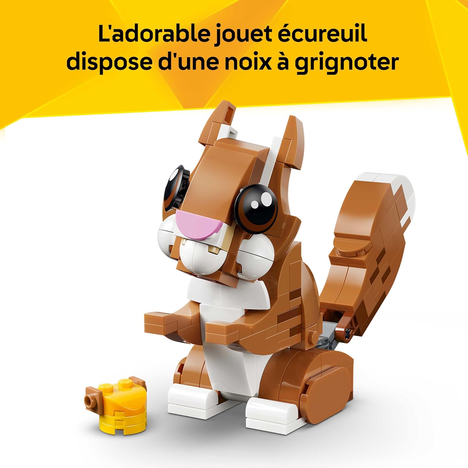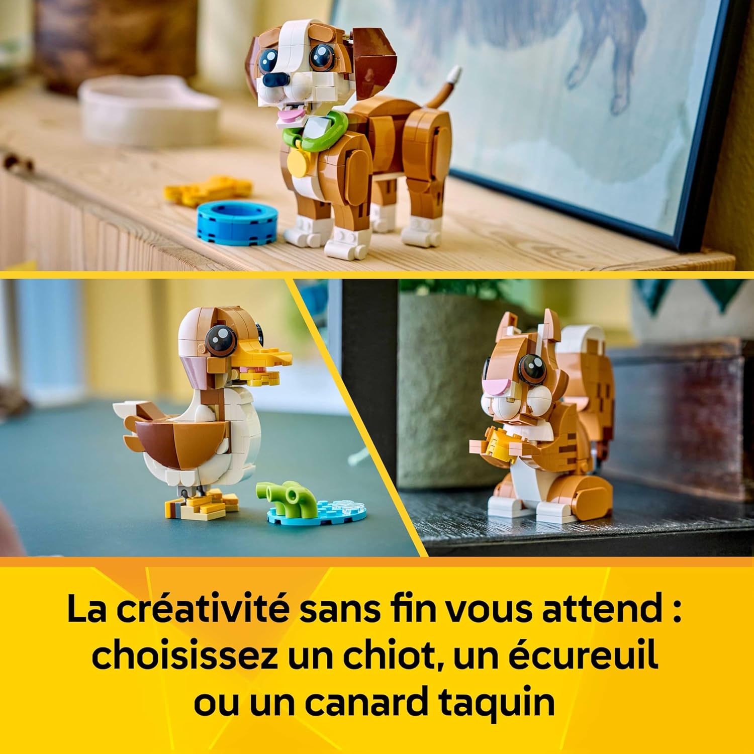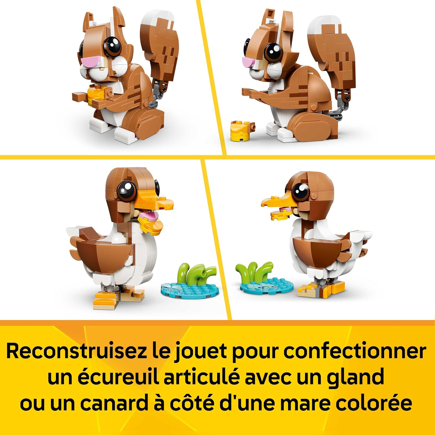 ANIMAUX LEGO ARTICULÉS – Le chiot bouge la tête, les oreilles, les pattes, la queue, les sourcils et la bouche pour afficher différentes expressions, l’écureuil a une queue & une tête mobiles, et le canard possède une tête articulée