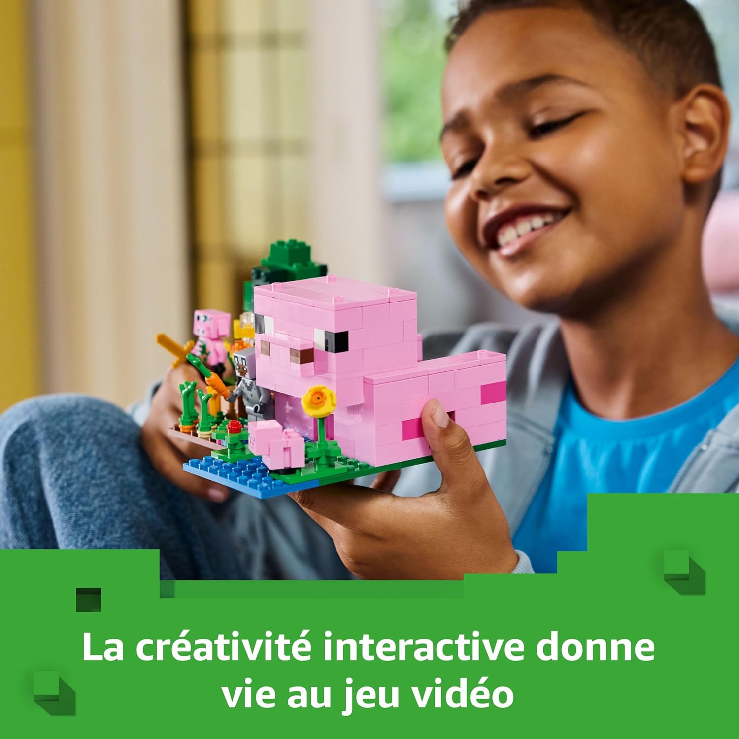 La maison de Porcelet LEGO Minecraft – Les enfants construisent une maison en forme de cochon qui comprend un potager où poussent des pommes de terre et des betteraves, un champ où Porcelet peut se rendre en passant par un portail et plus encore
